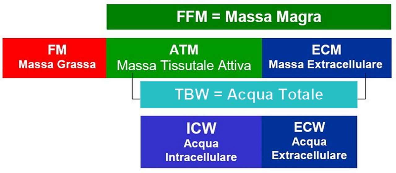 - massa magra FFM (free fat mass) composta da ossa, muscoli, minerali ed altri tessuti non grassi e suddivisa in massa cellulare o massa tissutale attiva e massa extracellulare.